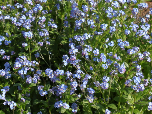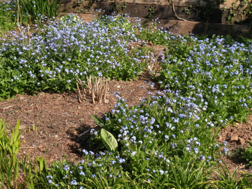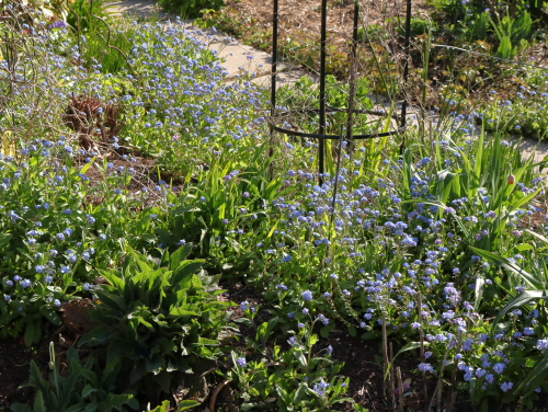 Some self sowers are unreservedly welcome, some unreservedly unwelcome, and several fall in between. Forget-me-nots fall in between; they are very pretty for a short while, stay quite small until just before they flower and are easily removed but they can seed prodigiously and be scarily prolific if given half a chance.