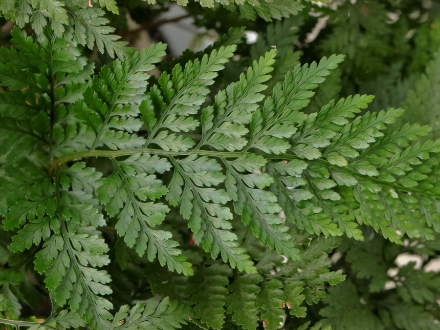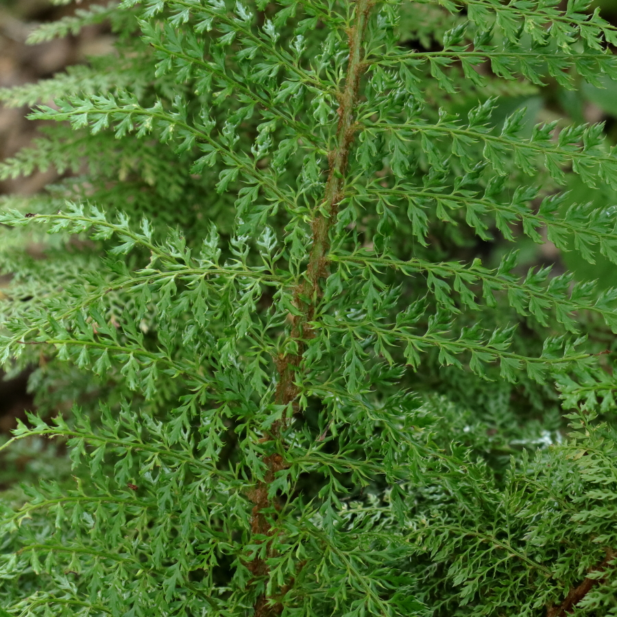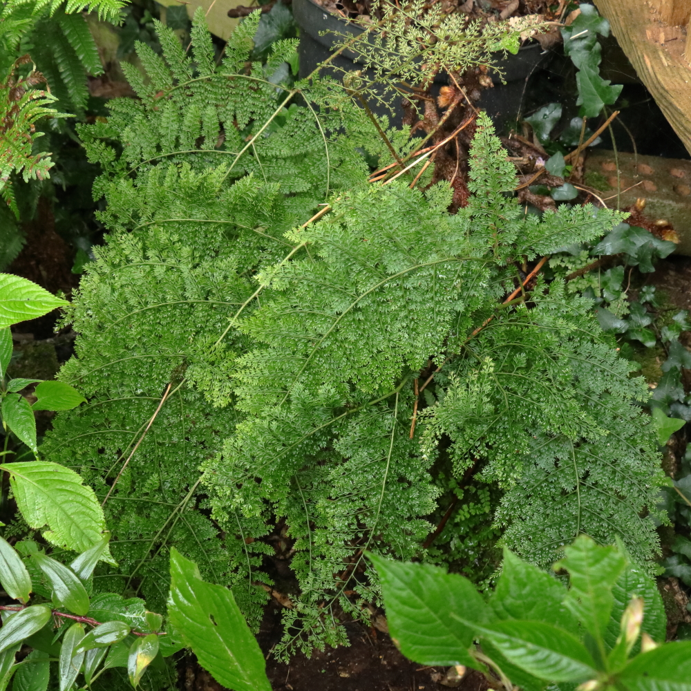 This came from Crug Farm plants a good few years ago, from whom I also bought Araiostegia parvipinnata. Crug still list this one but not A. parvipinnata. I can see no real difference between them so they may have turned out to be the same species. Looking them up on Plants of the World online, Araiostegia is shown as a synonym of the genus Davallodes and most of the species listed are shown as synonyms either of Davallodes or Davallia species. Thus there is a Davallodes pulchra, for which Araiostegia athamantica, A.pulchra and A. pseudocystopteris are synonyms; and there is a Davallia perdurans, for which Araiostegia faberiana, A. parva, A. parvipinnula and A. perdurans are synonyms. Since the two forms of Araiostegia that I have look almost identical it seems unlikely they are different species, far less in different genera. Looking online it seems that Davallia perdurans is likely the currently accepted name for probably both the plants I am growing. Suffice it to say that this plant is growing in a 10L pot, its rhizomes spilling over the sides and its fronds four or five times pinnate. I would have expected it to be easily propagated from section of rhizome but that hasn’t proved the case for me.