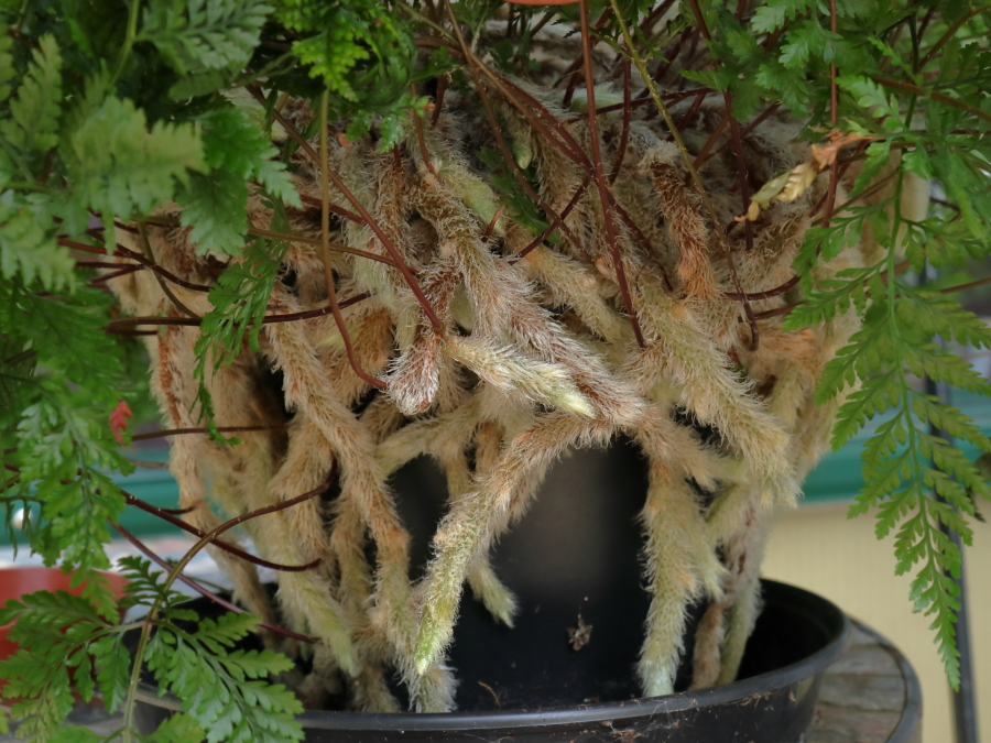 What is also sure is that it is a very beautiful fern of the squirrel’s or rabbit’s foot variety and my plant has all but hidden the pot it is growing in with rhizomes spilling over the rim. Repotting it into a bigger pot is both urgently needed and all but impossible.