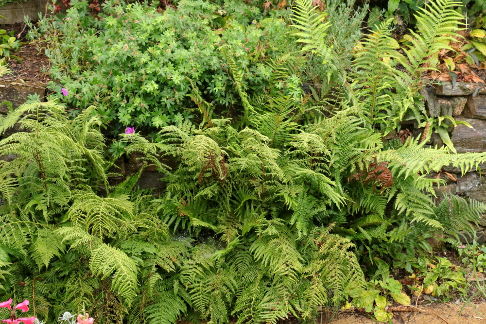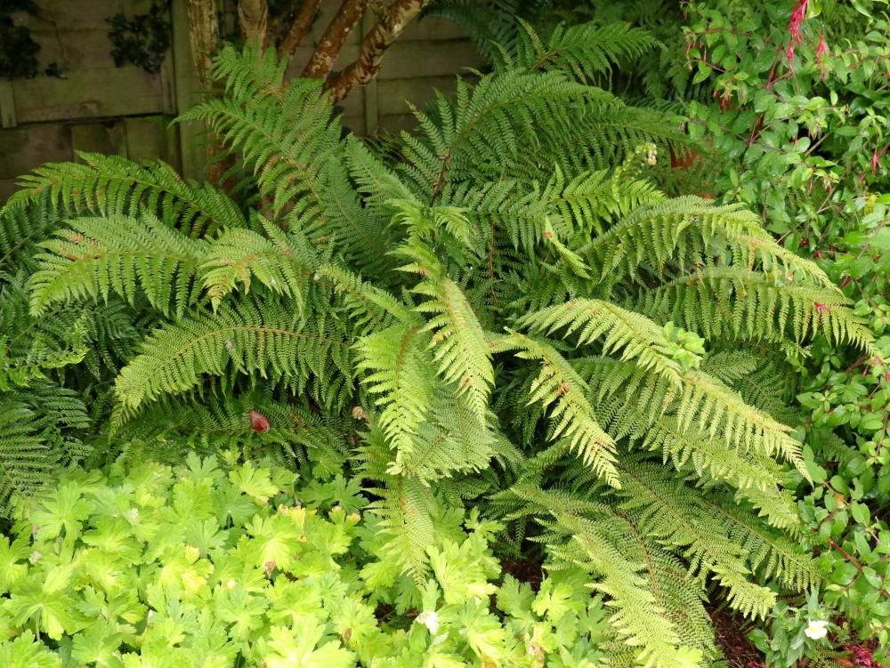 It would be nonsense to think of our native ferns as ordinary or even dull while spending good money on other species from further afield that to most people are barely distinguishable from them. The common male fern makes a large, wide spreading shuttlecock of fronds and to most people would be the ubiquitous and quintessential fern. I haven’t planted it, I didn’t need to; it arrived and made itself at home without my help. I have a couple of plants growing in a dry-stone wall in part shade and another growing in the ground in full shade. The UK has a number of native male ferns and as handsome as the common one is, it is, from an ornamental point of view, eclipsed by Dryopteris affinis, the golden or scaly male fern, which has much more conspicuous golden scales and lighter, slightly yellow, fronds.