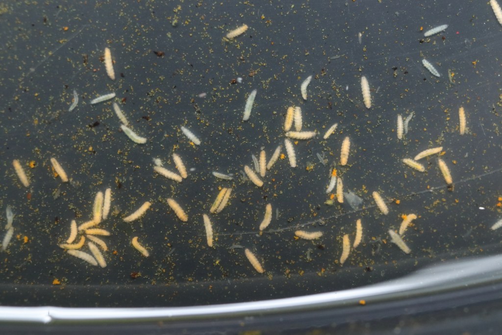 I picked off maybe 50 infested flower buds and put them in a jar, then cover them with water. An hour later I tipped them out into a plant saucer. I hadn’t broken up the buds at all but there were hundreds of larvae, some clearly moving, in the water. They obviously have no difficulty escaping from the flower buds and presumably in the garden will have been dropping to the ground freely. There are also thousands of specks which may or may not be eggs.