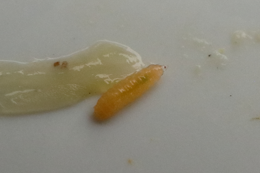 I picked off maybe 50 infested flower buds and put them in a jar, then cover them with water. An hour later I tipped them out into a plant saucer. I hadn’t broken up the buds at all but there were hundreds of larvae, some clearly moving, in the water. They obviously have no difficulty escaping from the flower buds and presumably in the garden will have been dropping to the ground freely. There are also thousands of specks which may or may not be eggs.