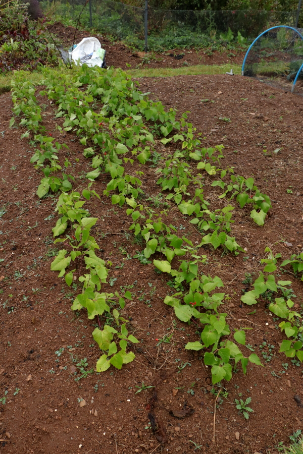 I sowed runner beans in late July, they started to come up on the 27th so were sown around the 20th. To my surprise they have shoots up to three feet long and are beginning to flower. They have no support so will sprawl around the ground and since I only planted them as a green manure crop I am unbothered by that, but it does make me think that I could have sown them with supports and probably got a crop of beans late in the season. We eat a lot of salads in summer and few cooked veg, so they would be of more use in September, perhaps even October, than in midsummer. I am keen to see what sort of crop this lot produce.