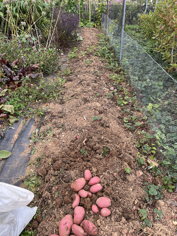 I have continued to dig ‘Kestrel’ potatoes as required, which hasn’t been a lot, and have now started on my maincrop, ‘Java’. The blight resistance of ‘Java’ seemed to break down quite suddenly several weeks after it had infected all the other potatoes on the allotment site, so I removed the tops, dried them for a few days, shredded them and spread them in my garden where there is nothing susceptible to blight. I have lifted a few plants and seem to have a decent crop with plenty of baking sized spuds to store for winter use. I now have to decide whether to leave the rest in the ground or lift them. They will be slug prone left in the ground so I’ll probably lift them.