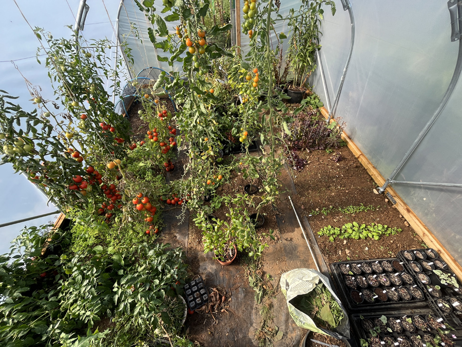 In my tunnel I have sown diakon radish, mizuna and carrots, all of which are up and growing away. They will be added to and will keep us in salad leaves through the winter. I have picked a lot of tomato ‘Akron’, which had a mighty crop, but will not be growing it again. I planted them directly into the soil, which has in the past, before the tunnel went up, been used for potatoes and much else. About half of them clearly became virus infected and while they still cropped well, the fruits had greenback badly and were almost inedible. The uninfected plants cropped twice as much, to the point I doubled up on their supporting strings, but still had greenback to a degree. In most cases I was able to eat two thirds to three quarters of each tomato.