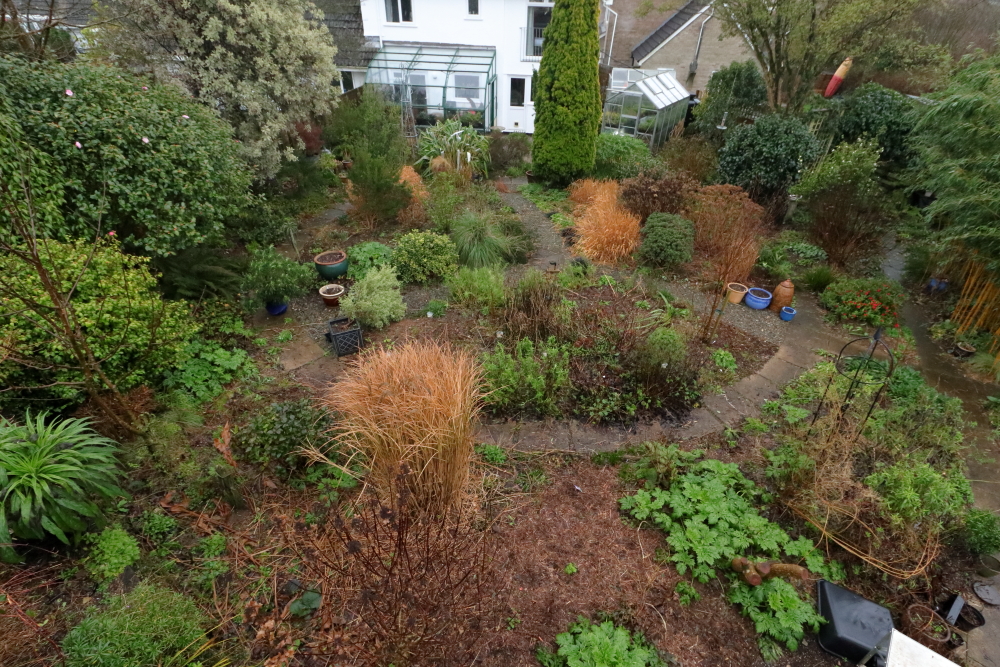 It was a typically dull morning on Thursday, heavy overnight rain had given way to drizzle. I climbed onto the bank at the back of the garden and hoisted my camera aloft on a long monopod to get this high view, primarily to highlight how bright Hakonechloa macra and its varieties are in these conditions. Last week’s storm thinned them out but the best one for both resilience and brightness is H. macra ‘Albostriata’. It’s paler and the leaves roll up somewhat if it gets dry, but that doesn’t happen a lot here in mid winter. Most years it gets left until the end of February when I cut it down as the new shoots start to emerge. The tall grass in the foreground is Miscanthus ‘Morning Light’.