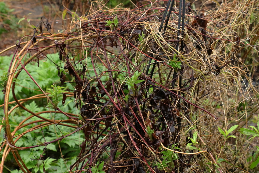 This melee consists of Maurandya barclayana, which is a perennial climber that usually dies in the winter, Fuchsia hatschbatchii, a hardy species Fuchsia that I usually cut to the ground each year only for it to grow back to 6ft or more and Clematis viticella ‘Polish Spirit’, already shooting away and due to be hard pruned in February. Most of the support for all of them has been a big Magnolia ‘Ann’ but I cut it down to around 2ft so it won’t be supporting anything this year, even if it shoots from the bare trunks. A dilemma for which I haven’t yet worked out a solution.