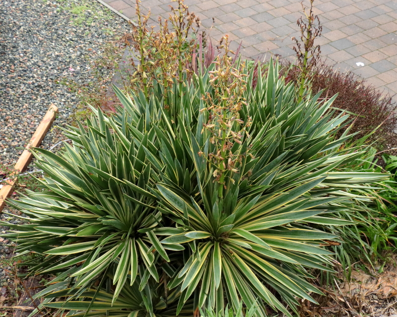 Yucca gloriosa ‘Variegata’ doesn’t seem to have a very fixed flowering time. This year it got it completely wrong, starting to put up flower spikes deep into autumn. I don’t recall when I first noticed them, but I thought at the time it had left it a bit late. Up they came, only for the buds to get frosted before a single one had opened. I need to cut them off but I’m never quick to tackle the Yucca, it’s a beast. It needs a lot of dead leaves pulling off too.