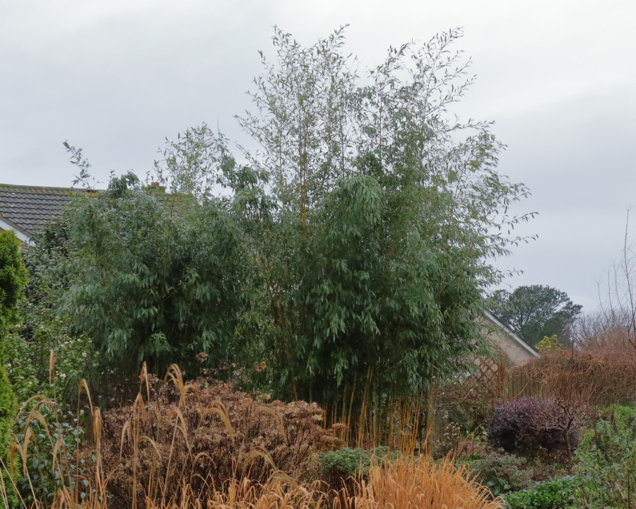 Another non flowerer to finish; I’m resisting the temptation to put in another Camellia. My Phyllostachys aureosulcata ‘Spectabilis’ produces a flush of new canes each year and the height they reach depends on how much moisture is around over the three months or so over which they grow from nothing to their full height. I remove old canes after 3-4 seasons so while the plant may have produced equally tall canes in the past, it hasn’t in the last few years. The relatively sparse leaved new shoots are 4-6 feet taller than they’ve been for several years. They’re not easy to measure until they’re cut down, but will be around 16ft.