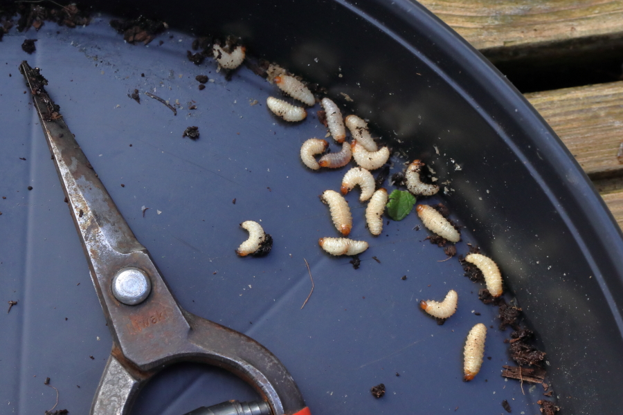 Ordinarily I’d have left the pot saucer with the vine weevils out in the garden for the birds to eat but it was windy and I was afraid they’d get tipped over and liberated.