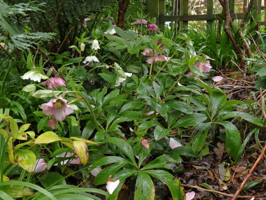 A couple of weeks back I put in a picture of a double flowered Hellebore and had a whinge about how they didn’t really thrive in our garden. That is true, and most of them get diseased and die out after a few years. However, they do set seed and I get carpets of seedlings, a great many of which get weeded out. Where they’re not competing with other plants I will leave them and this group are all self sown seedlings from a long forgotten parent. I think I may prefer the naturalised look to most of the snazzy hybrids I see in the garden centres and there’s no disputing that they are excellent value for money.