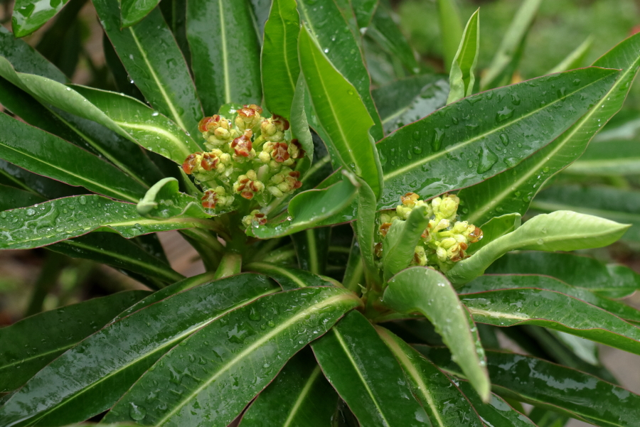 For a plant that most of the time is just green leaves, then when it does flower has very unshowy brown flowers, Euphorbia mellifera manages to be very ornamental. Such a rich green, enhanced by a white midrib and the finest red margin. Look how water droplets bead on the leaf surface and reflect the light. And the flowers have a strong honey smell, though I don’t recall seeing many, if any, bees on them. It’s growing in the poorest of soil and as much input as it gets from me is to hacked to the ground every second year when I get bored with its flowers. That’s usually around May but could be earlier this year, I don’t think it usually flowers this early.