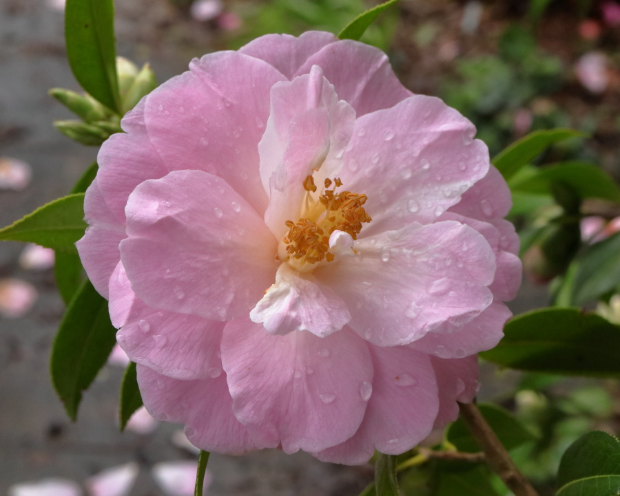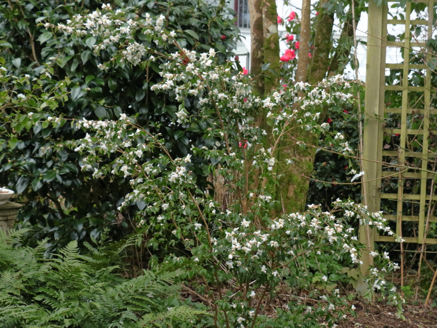 Camellia x williamsii ‘Charles Colbert’ is the largest camellia in the garden. I have cleared the lower branches so it has a tree habit and I prune it to keep it at around 12 feet in height. I also thin it fairly heavily every couple of years so that it is not too dense a dark blob against the sky. It gets a little bigger every year and I get a year older very year, so there will come a time when I prune it drastically, not least to allow its near neighbour Camellia transnokoensis, room to thrive. Will it be this year? Maybe.