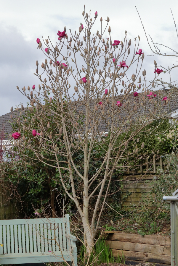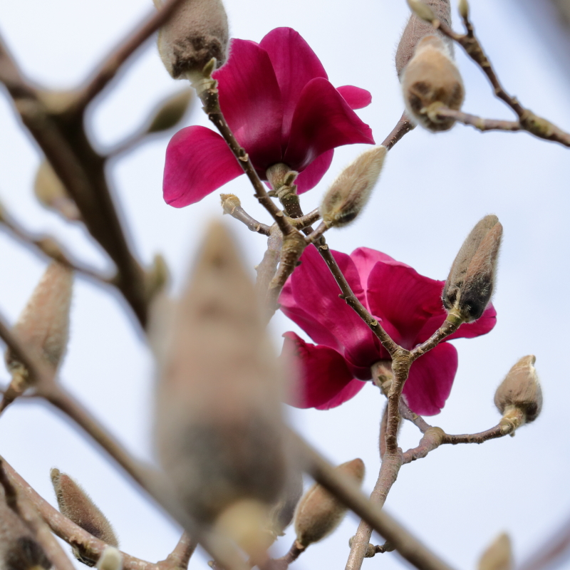 Magnolia ‘Vulcan’ starts flowering around this time each year and for the first few days has these rich maroon red flowers that are very often destroyed by frost or wind. As more flowers open they get progressively more purple and a somewhat flat greyish purple at that. Not horrible, but not great. Here are some of this year’s first round.