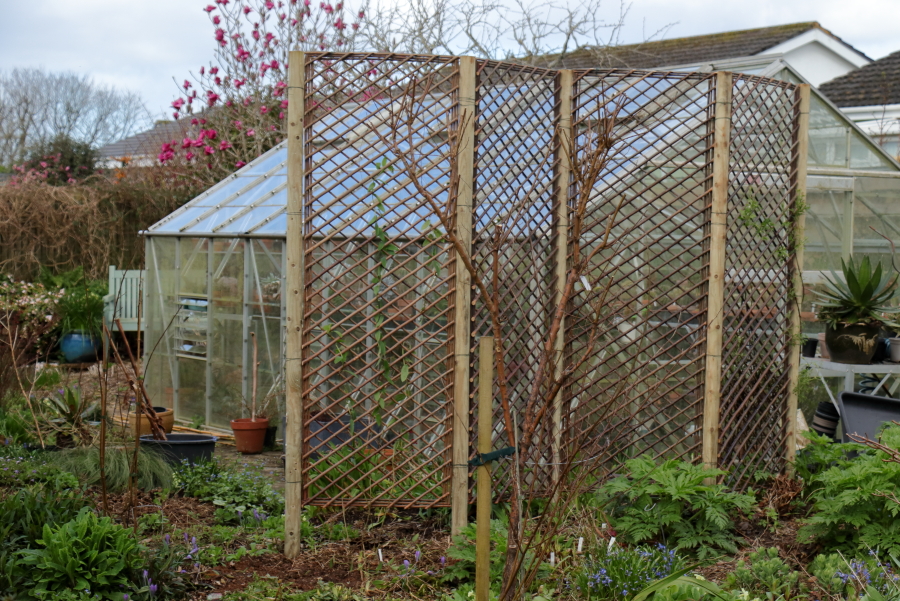 A week ago I put up a short run of willow panels up which I intend to grow a clematis which has for years sprawled over Magnolia ‘Anne’ but can no longer, she having been cut off at about knee height. While its construction was not a feature of this Saturday, the fact it is still standing certainly is. The clematis is at the right hand end. At the opposite end I have planted Bomarea caldasii, which I’m hoping can be protected from the ravages of slugs. I bought three pots of sweet peas to fill in between and provide flower in the earlier half of the summer.
