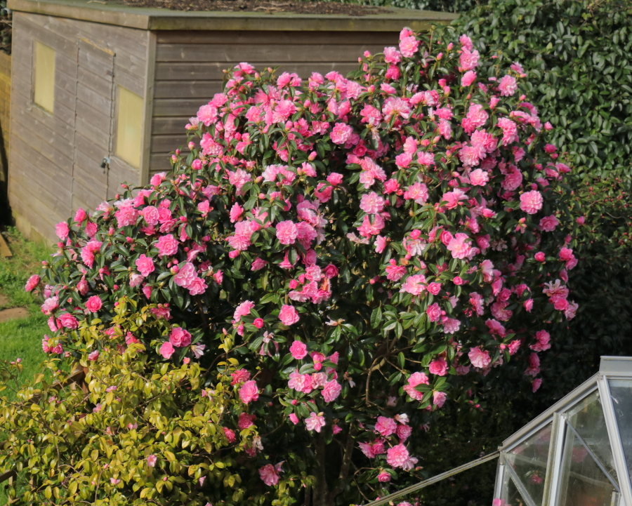 Camellia reticulata ‘Mystique’ is tucked in between a glasshouse and the neighbour’s fence so the best angle to see it from is an upstairs window. Last year when it had finished flowering I thinned it out by a considerable amount but the flower display is not much diminished. I seem to recall that it was looking pretty similar when the BBC came to film Camellias in my garden last year, and if you are in the UK you will be able to see it next Friday on Gardener’s World.