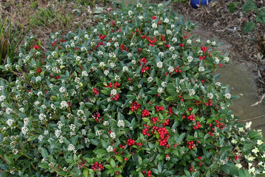 It’s the time of year when Skimmia japonica ‘Bowles Dwarf Female’ is flowering, with most of last season’s berries still in good condition on the bush. Not just two strings to its bow, but at the same time. In 2020 many of the persistent fruits sprouted viviparous seedlings, some of which I potted up. One of those seedlings is now flowering and is also female, so hopefully I will have another of this top performer on the other side of the garden.