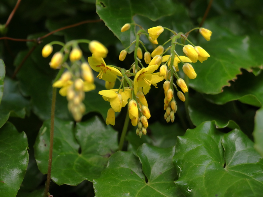 In theory, Epimedium perraldianum colchicum would get its attractive glossy evergreen foliage chopped off just before the emerging flower spikes get in the way. As usual, that didn’t happen, so the bright yellow flowers are either nicely displayed against a background of dark green foliage or, in most cases, hidden beneath it. Ho hum.