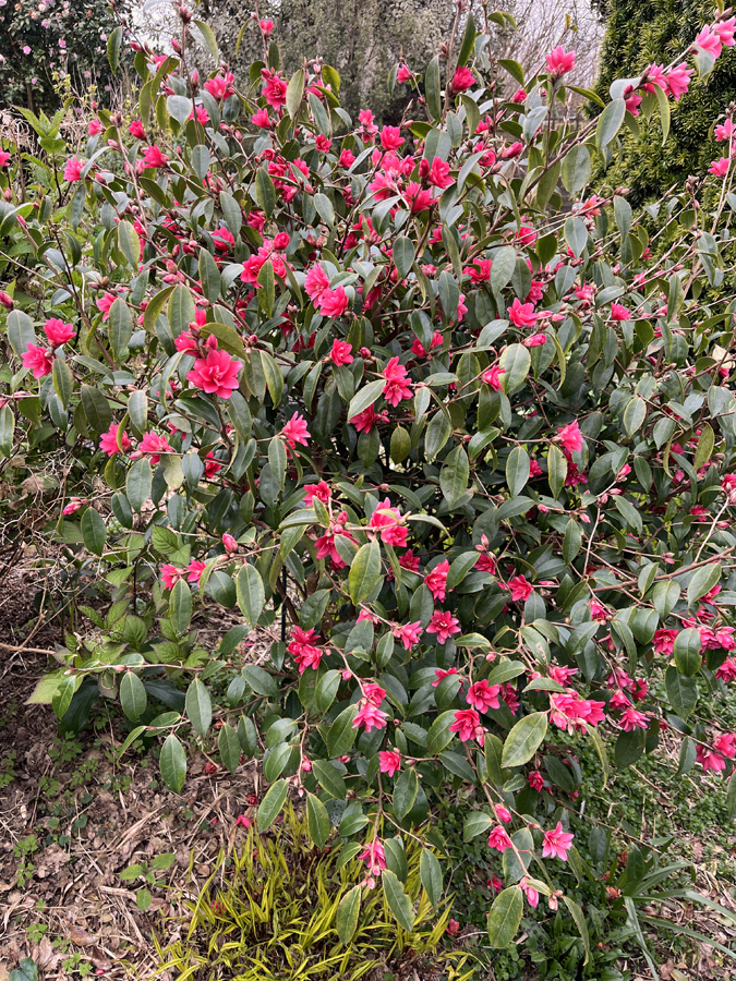 I took pictures with my phone, which isn’t the latest and the best camera wise. It automatically “enhances” the pictures, which can make a real mess of flower colours and I know I can change that but am not familiar enough with how for it to be easy. Thus this Camellia ‘Fairy Wand’ is an even more strident shade of pink than it is in the real world.