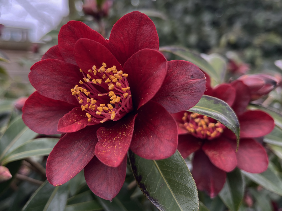 Camellia ‘Nightrider’ confused the camera exposure more than the colour. It’s a very dark red for a Camellia and since it is only the flowers on top of the bush that are so far open, it was taken against the sky. I suppose there is a way to do exposure compensation on the phone but I just tweaked the over exposed image on the computer.